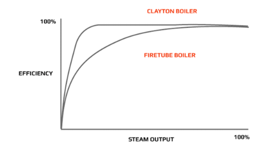 En Clayton dampgenerator holder den meget høje virkningsgrad helt ned til en ydelse på omkring 45%, inden den begynder at falde. Til sammenligning falder virkningsgraden på en traditionel dampkedel næsten øjeblikkeligt, når den ikke kører på fuld last. Se sammenligningskurve her.